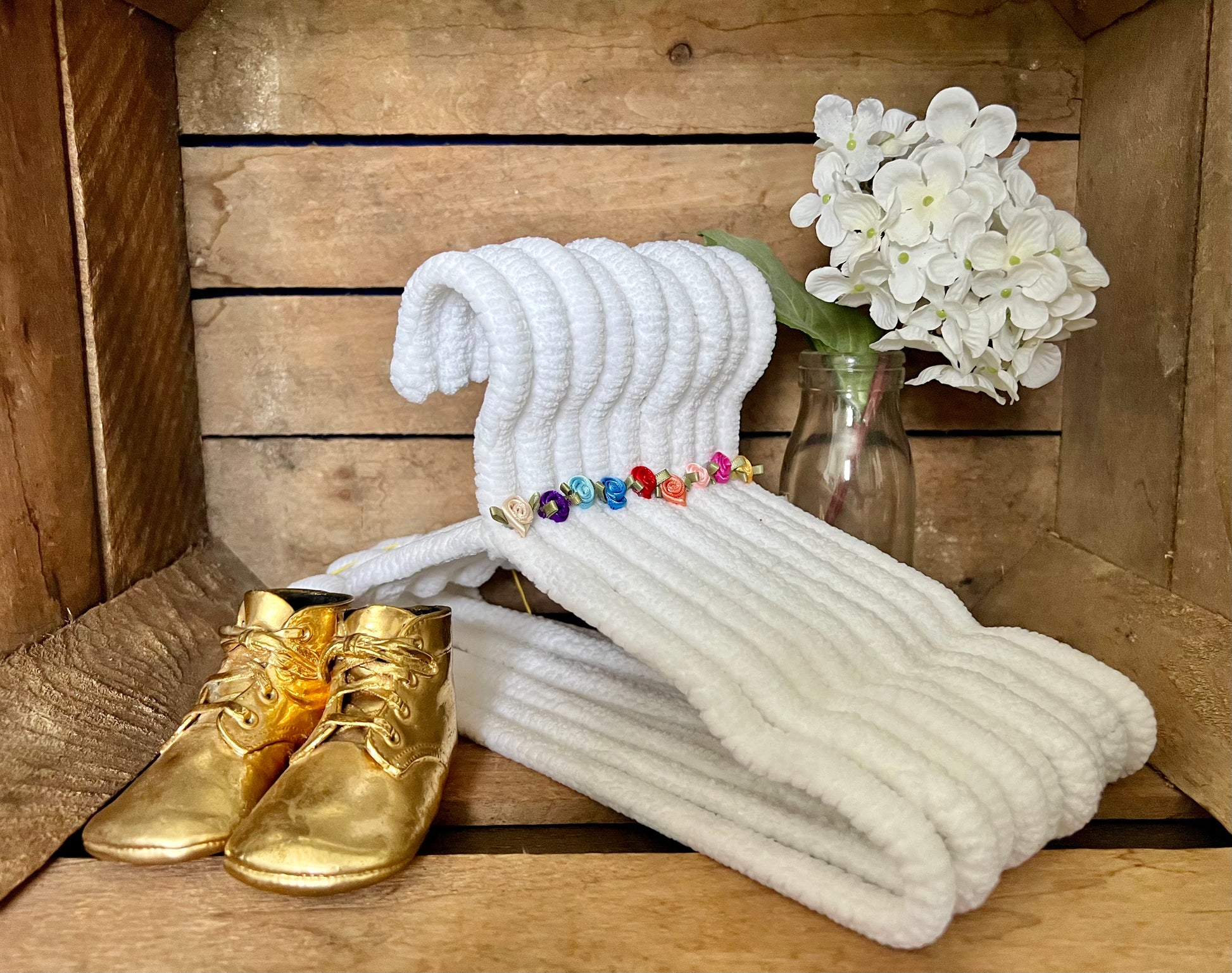 Our children's hangers are colorful, lightweight, and safe for little clothes. These hangers are created by wrapping a sturdy wire frame with soft yarn, giving them a textured and whimsical look. They come in various colors and patterns, making them appealing to kids and adding a fun touch to a child's closet.