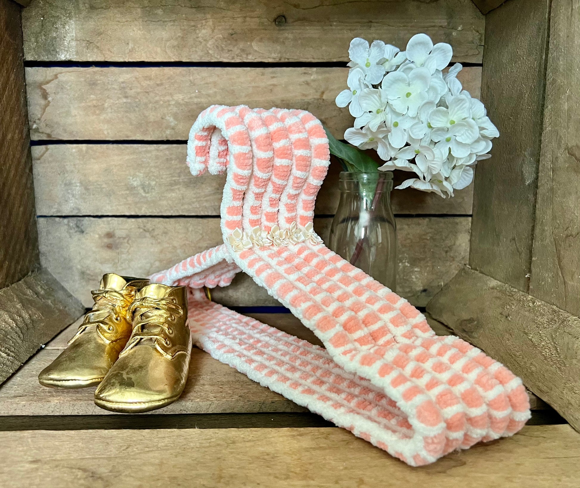 Our children's hangers are colorful, lightweight, and safe for little clothes. These hangers are created by wrapping a sturdy wire frame with soft yarn, giving them a textured and whimsical look. They come in various colors and patterns, making them appealing to kids and adding a fun touch to a child's closet.