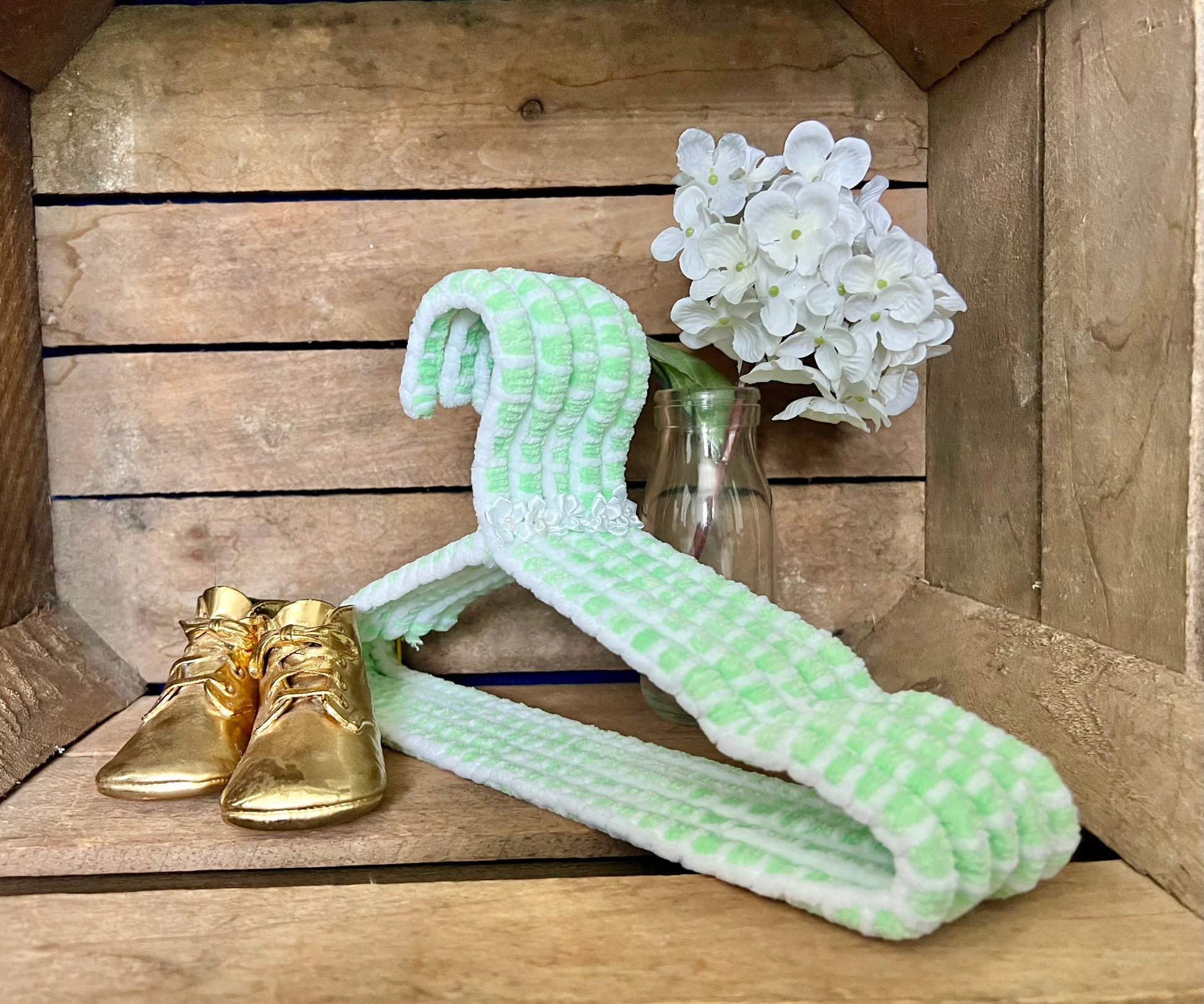 Our children's hangers are colorful, lightweight, and safe for little clothes. These hangers are created by wrapping a sturdy wire frame with soft yarn, giving them a textured and whimsical look. They come in various colors and patterns, making them appealing to kids and adding a fun touch to a child's closet.