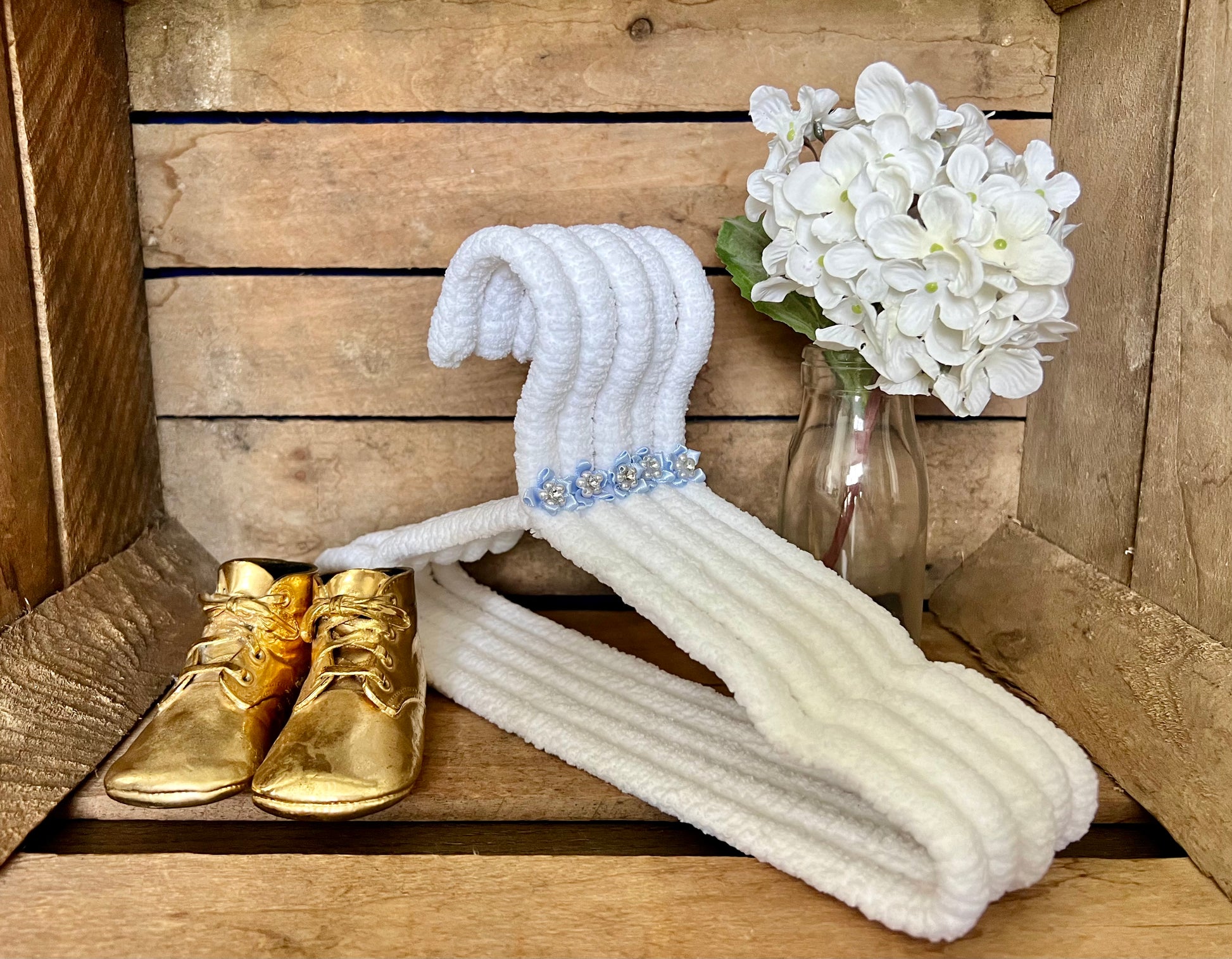 Our children's hangers are colorful, lightweight, and safe for little clothes. These hangers are created by wrapping a sturdy wire frame with soft yarn, giving them a textured and whimsical look. They come in various colors and patterns, making them appealing to kids and adding a fun touch to a child's closet.