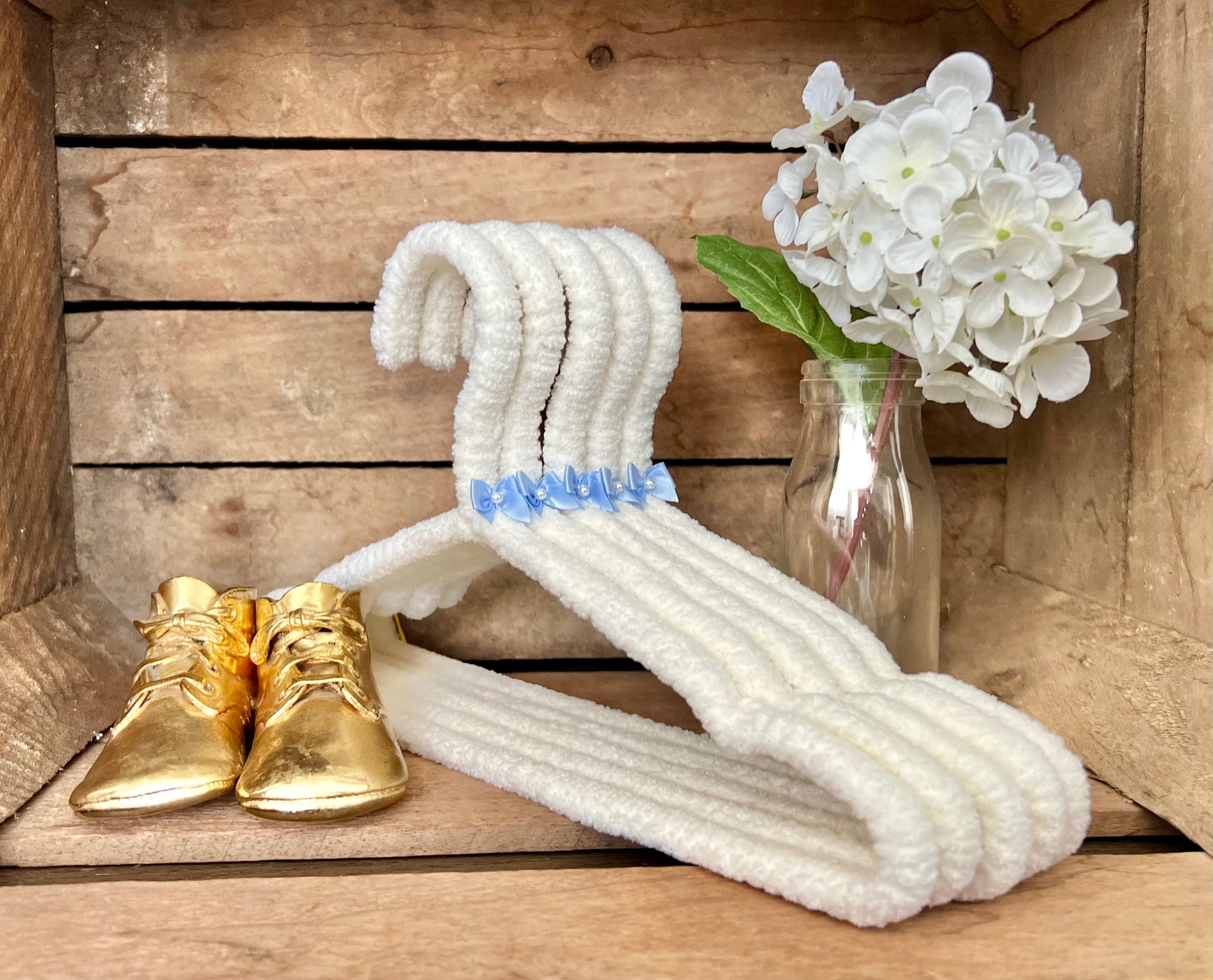 Our children's hangers are colorful, lightweight, and safe for little clothes. These hangers are created by wrapping a sturdy wire frame with soft yarn, giving them a textured and whimsical look. They come in various colors and patterns, making them appealing to kids and adding a fun touch to a child's closet.